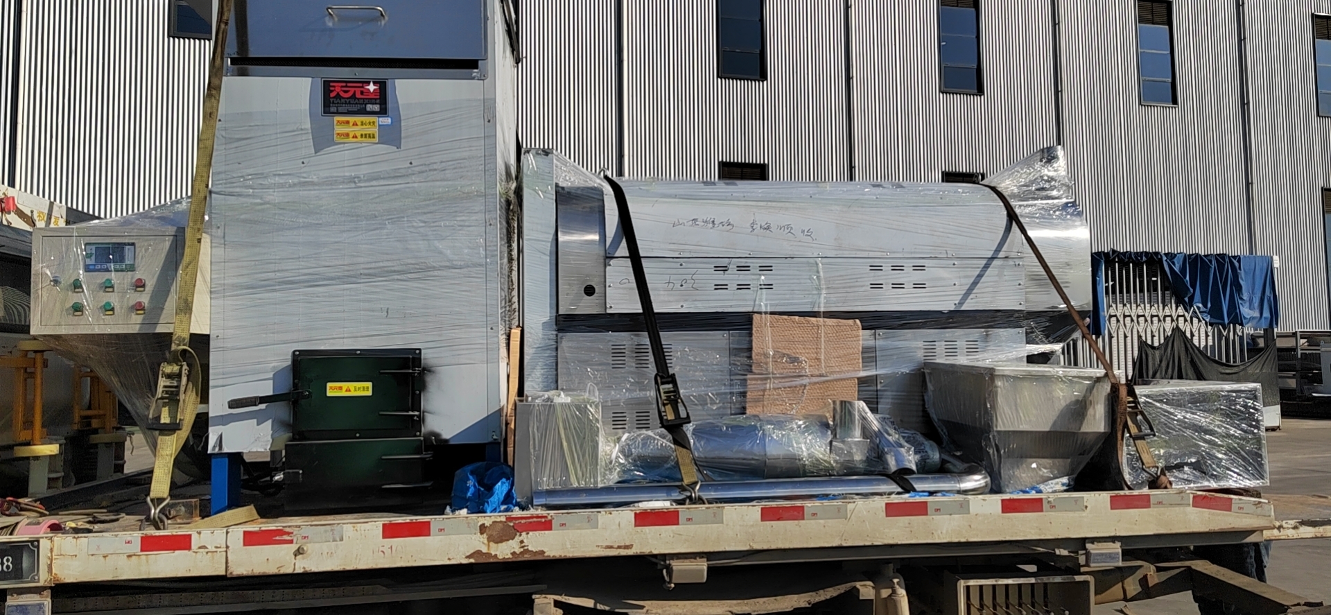 山東生物顆粒熱風爐左1臺,50螺旋除塵器1臺,2.2kw高溫風機1臺發貨